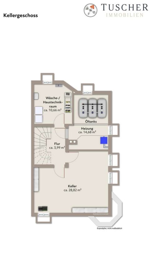 Im Kellergeschoss stehen weitere praktische Flächen bereit. Ein großer Kellerraum mit ca. 29 m² eignet sich hervorragend als Hobby-, Lager- oder Vorratsbereich, hinzu kommen ein separater Waschraum sowie der Heizraum in dem auch die Öltanks angeordnet sind.