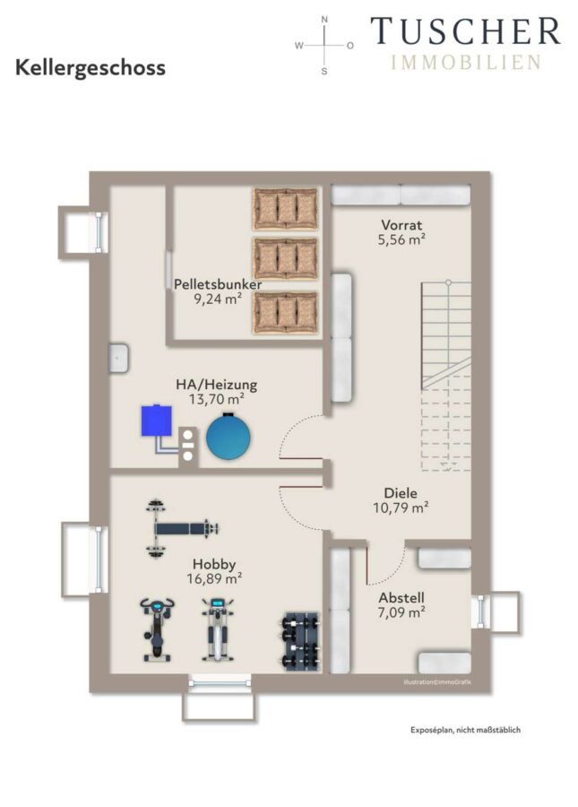 Der Keller bietet einen beheizten Hobbyraum, einen Abstellraum mit Waschmaschinenanschluss sowie den Heizraum inklusive Pelletslager.