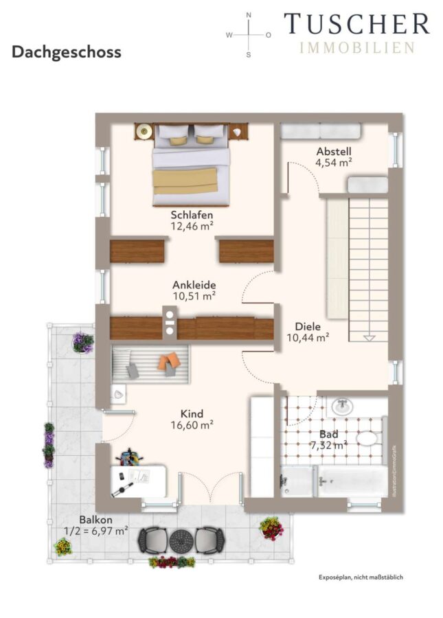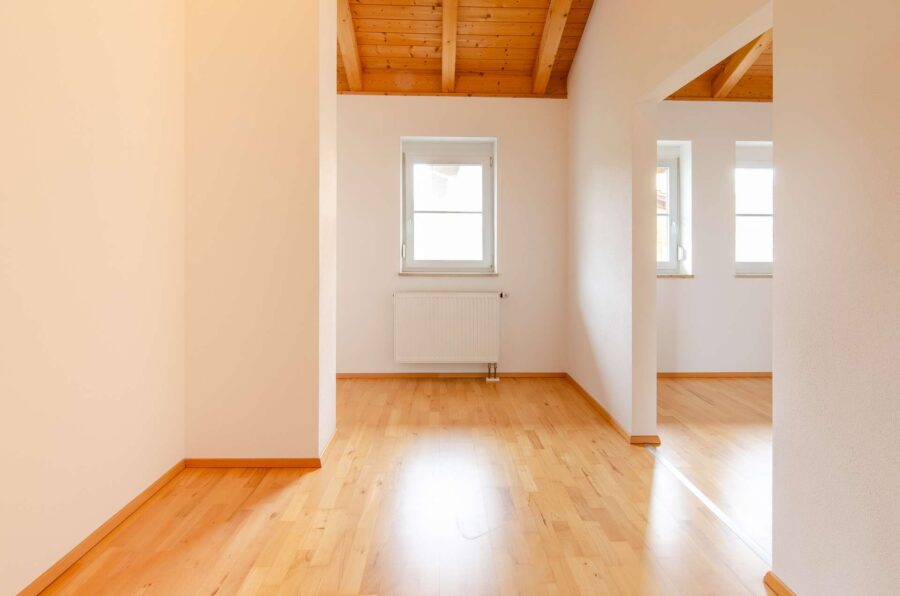 Im Dachgeschoss befinden sich ein Schlafzimmer mit Ankleide, ein großzügiges Kinderzimmer sowie ein zusätzlicher, flexibel nutzbarer Raum, der sich ideal als Homeoffice eignet. Das helle Badezimmer ist mit einer Badewanne und einer Dusche ausgestattet. Die hohe Raumhöhe in Kombination mit dem sichtbaren Dachstuhl verleiht den Räumen ein besonderes Wohngefühl.