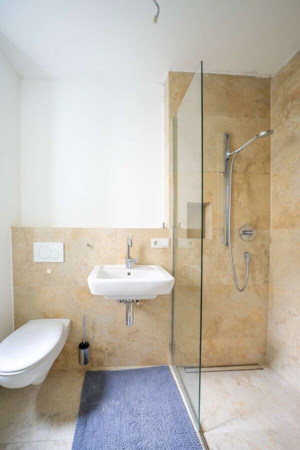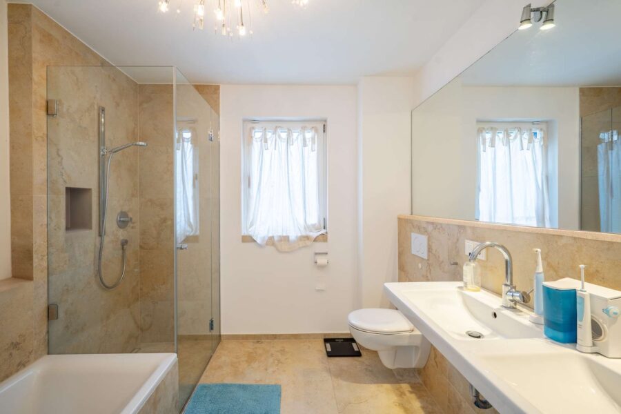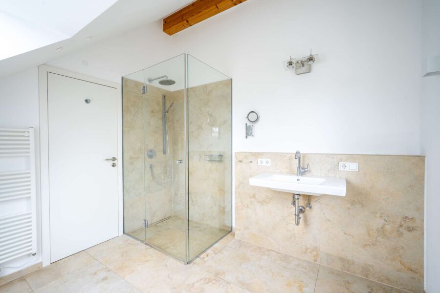 • zwei exklusive Badezimmer, eines mit Wanne, jeweils mit ebenerdiger Dusche inkl. Raindance, Doppelwaschtisch, WC und Tageslichtfenster