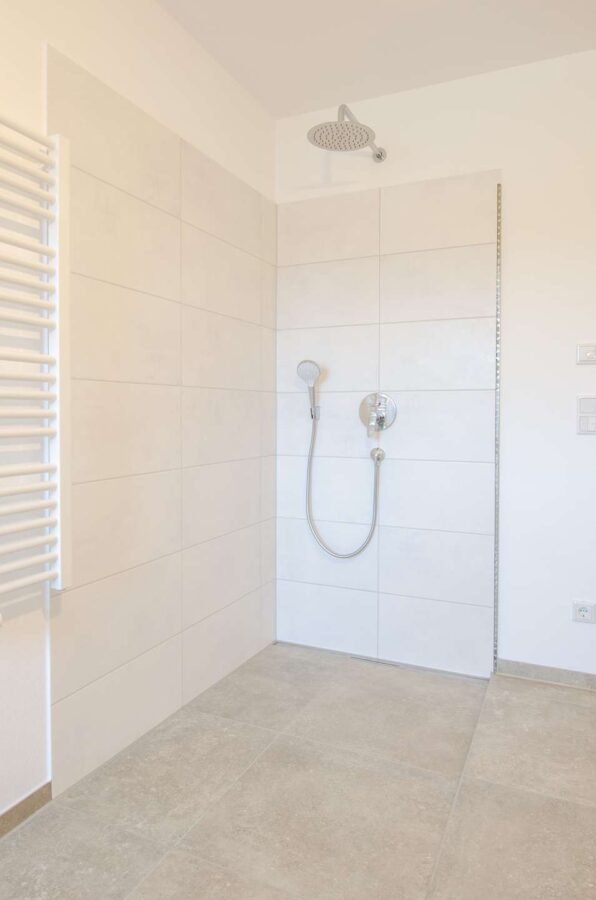 • modernes Bad mit bodengleicher Dusche, WC, Einzelwaschbecken, WM-Anschluss und Fenster