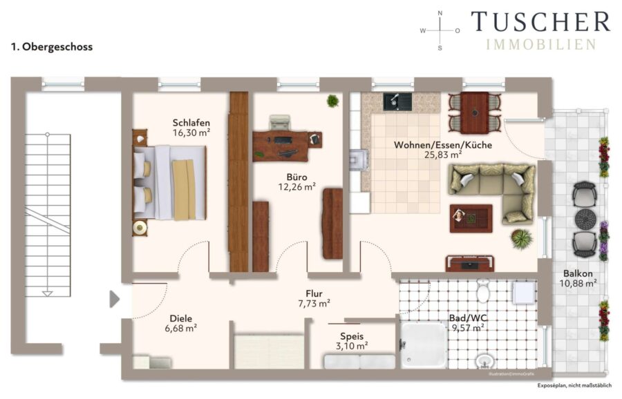 Diese ist aufgeteilt in zwei Schlaf-/Arbeitszimmer, einem großen Koch,-Ess- und Wohnbereich mit Zugang zum Balkon sowie ein modernes Bad.