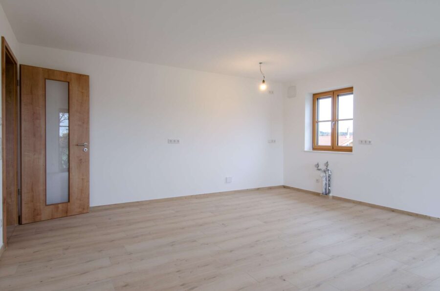 - Vinylboden in den Wohn- und Schlafräumen, Fliesen in Flur, Küche, Bad und Speiß
